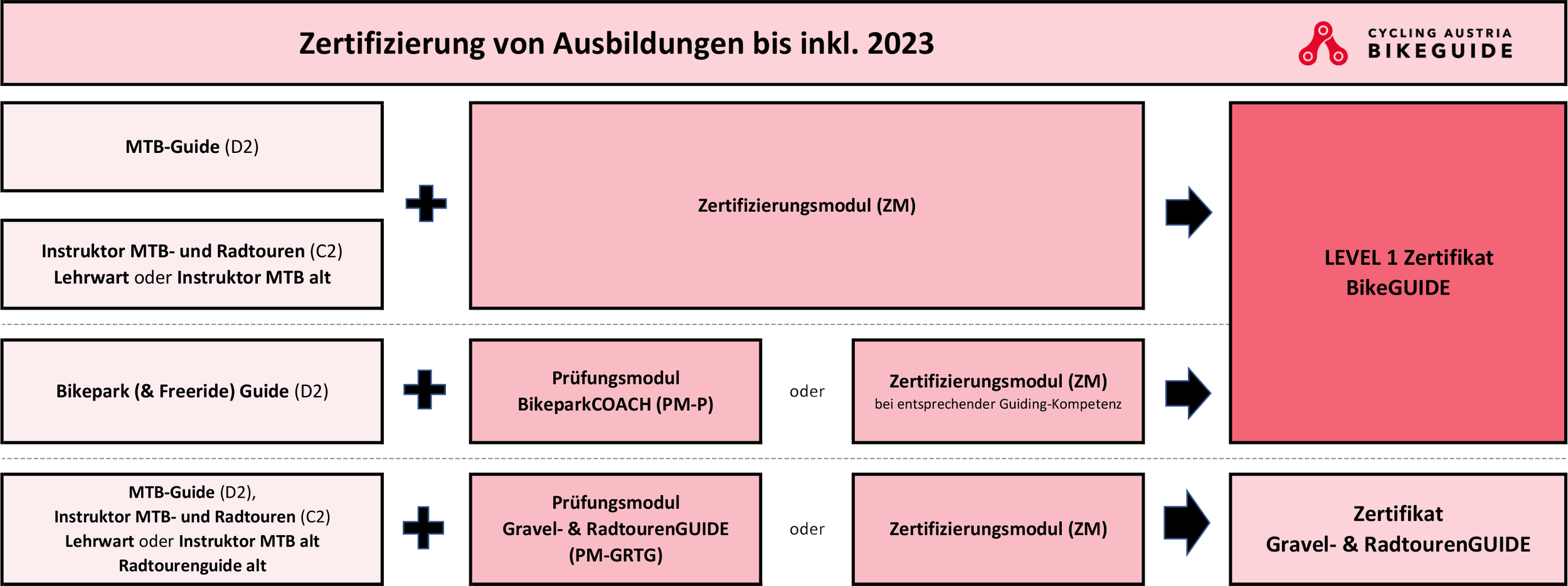 Um den Umstieg für Personen die bereits eine anerkannte Ausbildung im MTB-Guiding Bereich haben, möglichst unkompliziert zu gestalten und gleichzeitig das gewünschte Kompetenzniveau der zertifizierten Guides zu erreichen, bestehen folgende Möglichkeiten der Anrechnung: